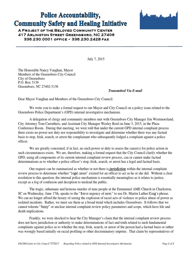 Letter Regarding Greensboro Police Complaint Review Process July 7 Letter To City Council Arrest Evidence